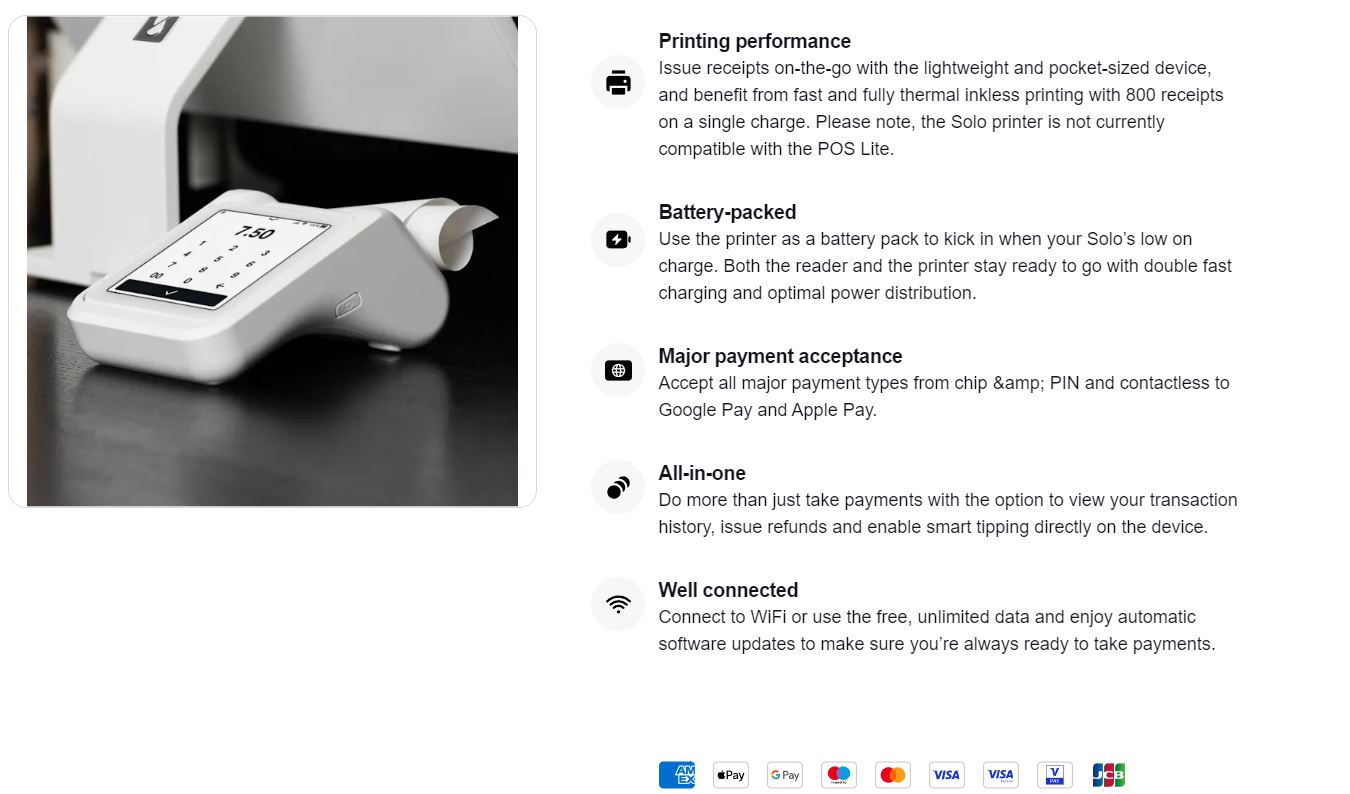 The SumUp Solo Card Reader with Printer is a versatile payment solution for businesses of all sizes. This compact device allows you to accept card payments anywhere, even without a smartphone, providing convenience and flexibility. With its built-in printer, you can issue receipts on the go, enhancing customer service and professionalism. The Solo and printer bundle is fully mobile, enabling you to conduct transactions on your countertop or while on the move. This user-friendly device features a simple touchscreen interface, making it easy to navigate and operate. Additionally, it can print up to 800 receipts on a single charge, ensuring uninterrupted service throughout your business day.